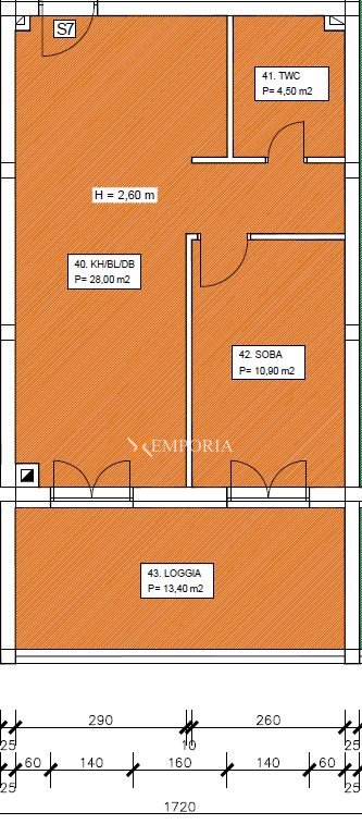 Raspored prostorija čine spavaća soba, kupaonica, kuhinja s blagovaonicom i dnevnim boravkom te lođa. Neto korisna površina opisanih prostorija iznosi 53,45 m².